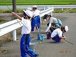 生活科の学習で、円城寺付近の用水路で夏の生き物ザリガニつりをしました。用水路の中にザリガニを発見して、つる前から大盛り上がりでした。釣り竿の先にさきいかをセットし、壁際を狙って糸を垂らし、じっと静かに待ちました。しばらくして釣り糸を引き上げると、ザリガニがさきいかをはさんでいました。全員つりあげることができました。