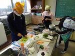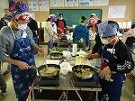学校のガスレンジは回すタイプの物で、火を付けるのもこわごわ行っていました。包丁の扱い方は日頃、家で手伝いをしている児童と初めてと思われる児童で一目瞭然でした。材料を切ること、炒めること、盛り付けること、洗い物をすること、調理には様々な行程があり、児童は互いに教え合いながら取り組んでいました。できあがった料理は、赤や黄色、緑と彩りのきれいな物もありました。緑が苦手で、入れていない人もいたようです。