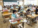 今日は糸をかけて、練習布で縫う練習をしました。手縫いの時にたくさんのボランティアの方に支援をしていただきましたが、今日もたくさんのボランティアの方が来校してくださいました。ミシンの糸のかけ方は、糸を通す順番に指を指しながら教えていただきました。返し縫いの方法も一人一人教えていただきました。「まがっちゃった。」「さっきよりうまく縫えた。」子どもたちは安心してボランティアの先生に教えてもらいながら、ミシンを使うことができました。