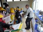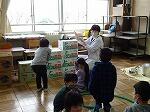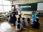 給食のできるまでの給食センターの様子やカレーを作るときの材料などを教えていただきました。ジャガイモは70㎏、にんじんは20㎏も使うそうです。また、一食あたりの給食の値段は240円と聞いて、「やすーい。」と子どもたちは驚いていました。調理員さんが使っている大きなひしゃくや大きなお鍋を使って、かき混ぜたり食缶に取り分けたりする作業も体験しました。