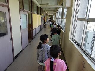 授業中ではなかったので、近くに先生がいなかった子どももいました。これまで、いざという時に安全な行動ができるように指導してきました。子どもたちは、室内では身を守るため机の下にもぐったり、外ではすぐ遊びをやめて、建物や倒れやすい物から離れ、身を低くする姿勢をとったりすることができました。その後、教室で人数確認を行い、振り返りをしました。急な訓練で驚いたと思いますが、子どもたちは、それぞれの場所で正しい避難を行い、大切な命を守る行動を確認することができました。