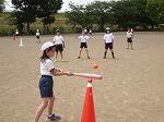 その後、やわらかいボールを使って、ティーボールの練習をしました。野球にはあまり接していない子どもたちが多いのですが、ティーに置いたボールを力一杯打ちました。打った後は1塁に向かって全力疾走です。