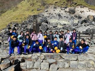 午後は、オリエンテーリングです。出発前に記念写真を撮りました。後ろに茶臼岳がきれいに見えています。
