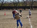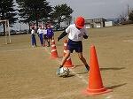 3・4年生が、体育でサッカー(ゴール型ゲーム)の学習をしています。今日は、とても風が強くて、ボールやカラーコーンが飛ばされそうでした。
