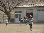 校庭は、すごく強い風が吹いていましたが、たこを揚げたくて飛び出していきました。