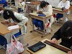 今日の学習は、「ボタン付け」と「波縫い」です。5年生も3回目の手縫いの授業となり、針と糸の扱い方も慣れてきました。玉結びや玉止めのやり方も覚えてできるようになっています。ボタン付けと波縫いも先生の指導で動画を確認した後、すぐ隣のボランティアの先生に手元の細かい動かし方を教えていただきながら、挑戦しました。