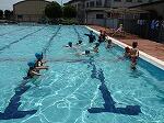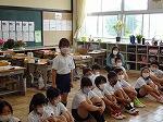 2年生がお手本を示し、1年生もまねをしました。プールを1周歩いたり、潜ってみたりしました。「学校のプールは大きい。」「泳いでもいい?」みんな元気に水遊びを楽しみました。シャワーを浴びてタオルで拭いて、自分でできました。これから夏の間、たくさんプールを楽しみましょう。