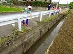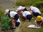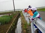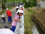 生活科の学習で、円城寺付近の用水路で夏の生き物ザリガニつりをしました。用水路の中にザリガニを発見して、つる前から大盛り上がりでした。釣り竿の先にさきいかをセットし、壁際を狙って糸を垂らし、じっと静かに待ちました。しばらくして釣り糸を引き上げると、ザリガニがさきいかをはさんでいました。全員つりあげることができました。