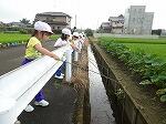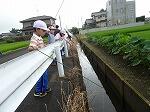 今日の1・2時間目に1年生が、生活科でザリガニつりに行きました。学校から歩いて7分ほどの場所に到着すると、用水路の中にザリガニが見えるので、子どもたちはやる気満々です。準備したザリガニつり用のつりざおにエサのスルメをつけて、さあ、つりをスタートです!!