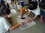 先生が食紅で色をつけた水につけておいた切り花を使いました。茎をカッターで薄く切って、プレパラートにのせます。顕微鏡の使い方は5年生で学習していたので上手に使っていました。