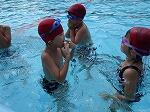 1・2年生は、プールで楽しくにらめっこや伏し浮きなどをしながら水に慣れることができました。はじめは顔を水につけるのも抵抗があった子でも、友だちと一緒なので少しずつつけられるようになってきました。