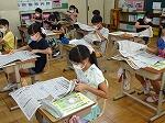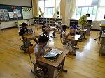 3年生は、わり算の練習をしていました。早く終わった子は読書に親しんでいました。2年生は、読書です。自分の好きな本を選んで夢中で読んでいました。1年生は、勉強のあと、ちょっと早めに朝の会を始めていました。日直さんの号令で元気よく朝のあいさつができました。