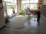 2時間目の終業式には、ほとんどの子が、着替えたり乾かしたりした服で参加できました。また、体育館では、換気を行い、お互いに距離をとりながら実施しました。
