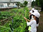 友だちとサッカーをしている子ども、虫取りをしている子ども、ブランコや築山では高学年の子どもが低学年の子どもと一緒に遊んでいます。農園では、4年生がヘチマが育つ様子を観察していました。
