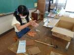 図工で『だんボールで、試して、つくって』の学習をしました。段ボールを切ったり、カッターで折りすじを入れて曲げたり、水につけてはがしたりしました。「わぁ、はがれるね!」「丸めたら、棒ができたよ!」と、いろいろ試すことができました。それを組み合わせて、巨大カブトムシや雪だるま、カービー、家など、いろいろな作品を作ることができました。
