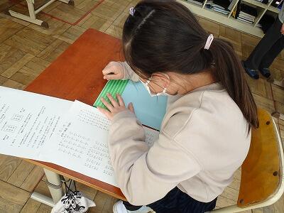 4年生は総合的な学習の時間に福祉について学習しています。今日は点字サークルの『てんとうむし』の皆さんが来校してくださり、点字について様々なことを教えてくださいました。実際に点筆(点字を打つ道具)を使って点字を打ち、学校名や自分の名前などを打ったオリジナルのしおりも作りました。児童からは『点字は点筆やパソコンで点を打って文字にすることが分かりました。』、『話を聞いて、点字がどこで生まれてどこから広がったのか分かりました。』といった感想がありました。『てんとうむし』の皆さん、本日はありがとうございました。