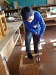 図工「のこぎりひいてザクザクザク」の学習で初めて、のこぎりを使いました。今日は角材をのこぎりで、時間いっぱい切りました。初めは、角材を足でおさせることも、のこぎりの歯を角材に入れることも、両手で押したり引いたりすることもできませんでした。けれど、時間が経つとあちこちから「ザク、ザク、ザク」と、とてもよい音が聞こえてきました。「大工さんってすごいなあ。大工さんの苦労が分かったよ。」「もっと切りたいなあ。」と、楽しそうでした。