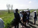 最初に、 部屋小の近く蛭沼にある「山王寺大桝塚古墳」(さんのうじおおますづかこふん)に行きました。6年生は見たことはあるのだけれども、実際に調べるのは初めてではないでしょうか。この古墳は県内屈指の前方後方墳です。この墳形はたいへん珍しく、下都賀地区ではこの古墳しかありません。なんと全長96mの大きな古墳です。