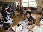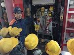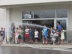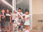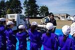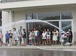 最初に、ポンプ車の放水を教わりました。ホースが暴れないようにしっかり持つことが大切だということを4年生は体験しました。次に、いかに正確に燃えている箇所に水をかけるかです。2つの的を用意していただき、4年生は見事に水を的中させていました。また、消火器でも的に液体を当てる体験をしました。