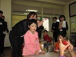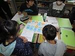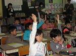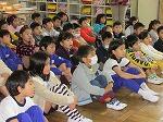1年生はお手玉やコマ回し、あやとり、竹とんぼ、カルタ取り、おはじき、竹鉄砲などの昔の遊びを教えていただきました。子どもたちはお手玉3つを上手に操るおばあちゃんの技にびっくりしました。また、ベーゴマについては、床(トコ)と呼ばれる土俵の中にベーゴマを入れて飛び出したら負けになることなども実際にやっていただき、1年生は見て聞いて覚えることができました。