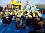 第一排水門は調節池の中で最大容量の第一調節池の南端にありました。現在は、開閉装置の交換工事が行われています。今回の学習会は被災した子どもたちに遊水地への理解を深めてもらおうと、栃木市が企画したものだそうです。国土交通省利根川上流河川事務所や工事を担当する建設会社が協力して実現したものです。