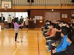 はじめは、体育館で集会を行い、在校生代表のあいさつや「宝、言葉さがしウォークラリー」の説明がありました。