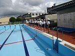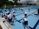 6年生はプールの本体や壁の部分をブラシできれいにし、5年生はプールサイドや更衣室などを掃除しました。子どもたちも先生も力を合わせて作業し、広いプールがとてもきれいになりました。掃除後のプールで記念写真を撮りました。5・6年生の皆さん、先生方、ありがとうございました。お疲れ様でした。
