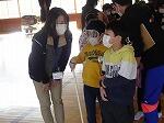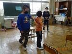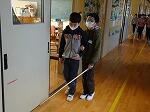 次に、アイマスクをつけ白杖をもった子どもと介助する子どもがペアになって、歩くときの介助体験をしました。体育館で歩く練習をしましたが、平坦で障害物がない所でも目が不自由だと不安になることがわかりました。