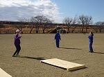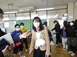 次に、バトンを使ったパスの練習です。どのようにもらったらよいか、どのように渡したらよいか考えながら練習に取り組みました。