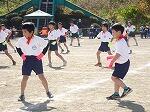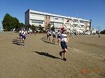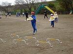 上学年は、障害走、徒競走、鼓笛と続けて練習です。障害走は、カードに書かれた数のパンケーキを運びます。フラフープを跳ぶときは体を縮めて工夫しています。3年生は走りませんが、準備のお手伝いをして大活躍です。
