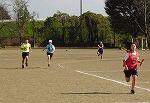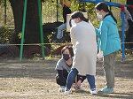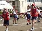 二人一組で大きな輪をもって走ります。班の担当の先生の体を通してもどります。輪をバトンにして次のペアにつなぎます。初めての練習でしたが、とてもよくできました。