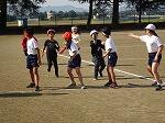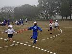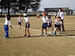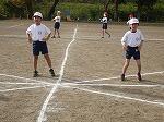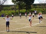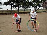 二人一組で大きな輪をもって走ります。班の担当の先生の体を通してもどります。輪をバトンにして次のペアにつなぎます。初めての練習でしたが、とてもよくできました。