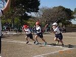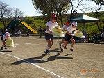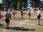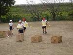 上学年は、障害走、徒競走、鼓笛と続けて練習です。障害走は、カードに書かれた数のパンケーキを運びます。フラフープを跳ぶときは体を縮めて工夫しています。3年生は走りませんが、準備のお手伝いをして大活躍です。