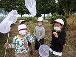 これまで見つけた虫は、コクワガタ、アゲハチョウ、バッタ、カエルなどでした。子どもたちの服装を見ると、長袖の服が多く、季節はすっかり秋です。夏にはいなかった秋の虫が見つけられるかな?新しい発見をめあてに網を持って、広い校庭へ出かけました。