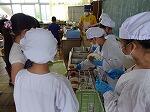 感染症予防のため、先生が机の上を消毒します。1・2年生は、身支度をした先生たちが配膳をしました。3年生以上は自分たちで配膳しますが、これまでと違って使い捨ての手袋をするなど慣れないこともあったようです。