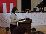 1年生のみなさん、こんにちは。1年生の皆さんが入学してくるのをとても楽しみにしていました。今から3年前の9月に大雨が降りましたね。そのとき、この体育館や1階の教室は水につかってボロボロになってしまいました。でも、たくさんの人たちの協力で、学校は元通りになりました。なので、みなさん学校を大切に使いましょう。