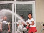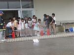 最初に、ポンプ車の放水を教わりました。ホースが暴れないようにしっかり持つことが大切だということを4年生は体験しました。次に、いかに正確に燃えている箇所に水をかけるかです。2つの的を用意していただき、4年生は見事に水を的中させていました。また、消火器でも的に液体を当てる体験をしました。