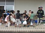 続いて、土のう運びを体験したり、消防団の敬礼を教えていただいたりして、校庭での体験学習は終了しました。