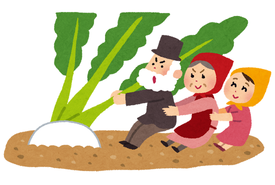 おばあさんを呼んで来て、おばあさんがおじいさんを引っぱって、おじいさんがかぶを引っぱりますが、それでもかぶは抜けません。