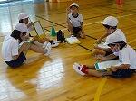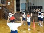 3・4年生が、体育で新しい種目に挑戦しています。もともと校庭でティーボールをやっていましたが、雨のため体育館でできるようにルールを改良したものです。