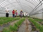 子どもたちは、説明を聞きながらイチゴ農家の仕事と比べていました。1つのハウスに1500株育てていることや、一度枯れるまで育てた後で、土の中で栄養をたくわえると、次に出てきたニラを収穫しても、1月ほどでまた育つことなどのお話しを聞くことができました。