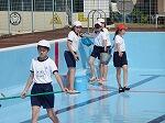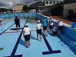 6年生はプールの本体や壁の部分をブラシできれいにし、5年生はプールサイドや更衣室などを掃除しました。子どもたちも先生も力を合わせて作業し、広いプールがとてもきれいになりました。掃除後のプールで記念写真を撮りました。5・6年生の皆さん、先生方、ありがとうございました。お疲れ様でした。