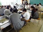 今日の学習は、「ボタン付け」と「波縫い」です。5年生も3回目の手縫いの授業となり、針と糸の扱い方も慣れてきました。玉結びや玉止めのやり方も覚えてできるようになっています。ボタン付けと波縫いも先生の指導で動画を確認した後、すぐ隣のボランティアの先生に手元の細かい動かし方を教えていただきながら、挑戦しました。