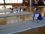 長い跳び箱を横向きに置き、足を広げずしゃがむような姿勢で跳び越す「腕立て閉脚跳び」に挑戦します。まずは準備体操をしっかり行い、1段の跳び箱から2段、3段・・・8段と用意し、自分に合った跳び箱を選んで跳び始めます。跳び終わった児童は、マットがずれないよう押さえたり友達にアドバイスしたり、協力して練習に取り組みました。