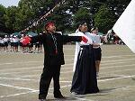 「運動会の歌」を精一杯大きな声で歌いました。紅組・白組ともに気合いがみなぎっていました。紅組団長は三田さん、白組団長は毛塚さんです。両団長が皆をまとめ、とも素晴らしい応援合戦でした。
