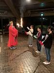 また、昨夜のキャンプファイヤーの様子の写真も送られてきましたので、ご紹介します。柏原先生が火の神様になって、トーチの火を代表の子どもたちに分けています。
