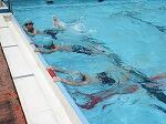 3・4年生は、クロールの手の動きを練習しています。けのびの姿勢からバタ足と手の動きを加え、よく体を伸ばしたフォームで泳げています。5年生は、水慣れで体の力を抜くことを練習しました。仰向けになって力を抜いても沈まないことがよくわかったようです。6年生は、平泳ぎの脚の動きを練習しました。足のつま先の向きを意識して練習に取り組めました。