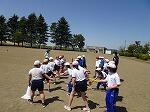 次に、バトンを使ったパスの練習です。どのようにもらったらよいか、どのように渡したらよいか考えながら練習に取り組みました。