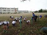 3・4年生は、鉄棒運動に取り組みました。草がたくさん生えてしまったので、まずはみんなのために草むしりです。5分程度でしたが、鉄棒の周りがきれいになりました。
