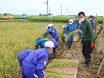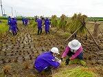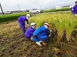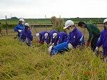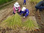 4月に田植えをした田は、すっかり黄金色に姿を変え、稲は穂を垂れて刈り取られることを待ち望んでいるかのようです。渡邊さんから稲刈りの仕方を教えていただいて、みんなで稲刈りです。「コツが分かってきた。」「稲を縛らなくちゃ。」「これ、干してきて。」「こんなに刈り取れたよ。」